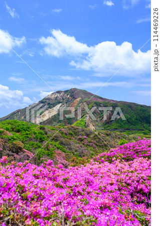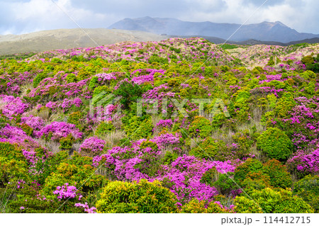 阿蘇山頂周辺 阿蘇山 中岳火口を背景に映える絶景ミヤマキリシマの花風景(阿蘇山中岳・阿蘇火口周辺)