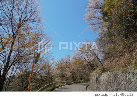里山の春 青空を背景に茨城県桜川市高峯の林道入口よりの山桜の咲く風景