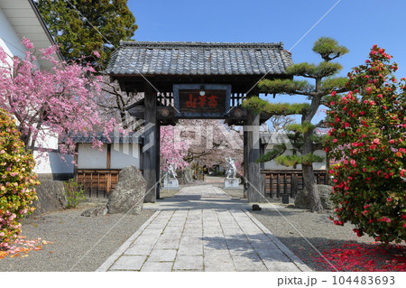 山梨県 山門と満開の桜 4月