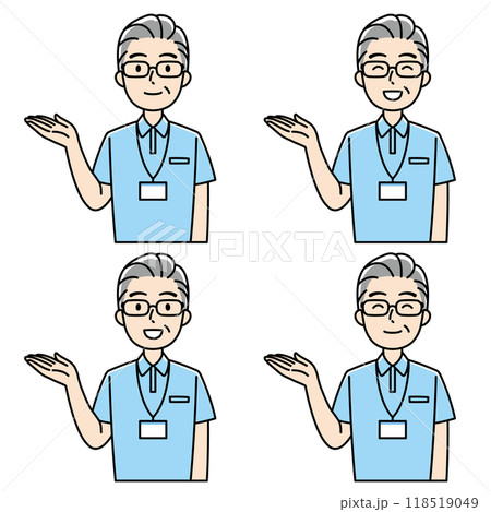 笑顔で案内するポロシャツのシニア男性(右手・カラー)
