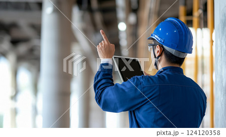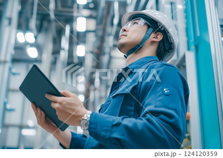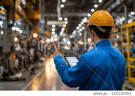 現代の工業エンジニア、防護装備を着用、タブレットでスマートファクトリーの運営を監視