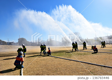 出初式での消防隊による放水訓練