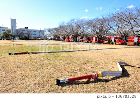 出初式での放水訓練の準備で置かれた放水ホース