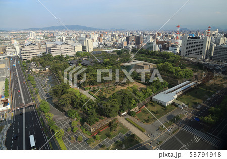 高松市立「玉藻公園」高松城跡の天守台から見た琴電高松築港駅、高松シンボルタワー、ホテルクレメント高松