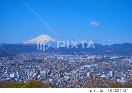 春の神奈川県秦野市の弘法山公園の権現山展望台から西側の眺望(秦野市,富士山,金時山,高松山など)
