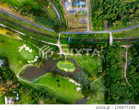Aerial view drone shot of beautiful green golf field fairway and putting green Top down image for sport background and travel nature background Amazing view.