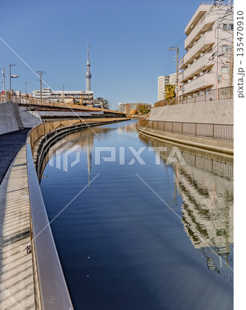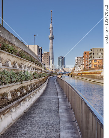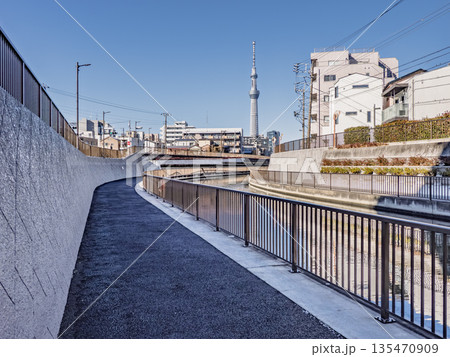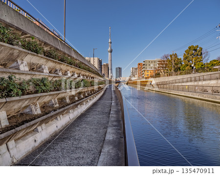 東京スカイツリーを望む北十間川の遊歩道と川面(東京都江東区・墨田区)
