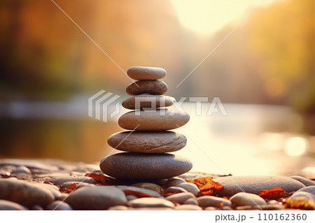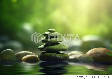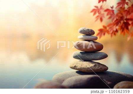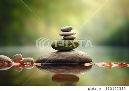 禅石は穏やかな水辺に置かれる。美しい自然環境や精神性の高さや慈悲と悟りのための禅。AI生成画像