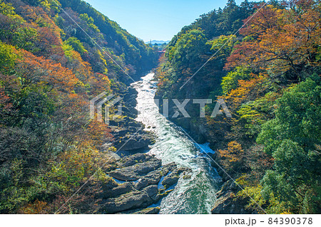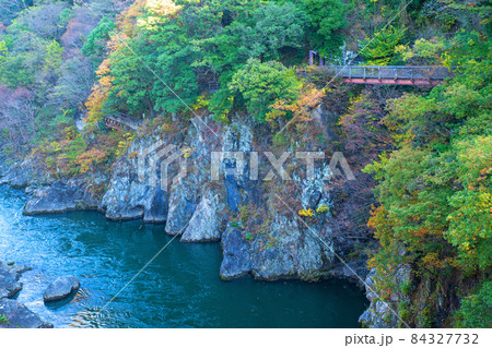 群馬県みどり市大間々町 高津戸峡遊歩道と渡良瀬川紅葉と高津戸橋