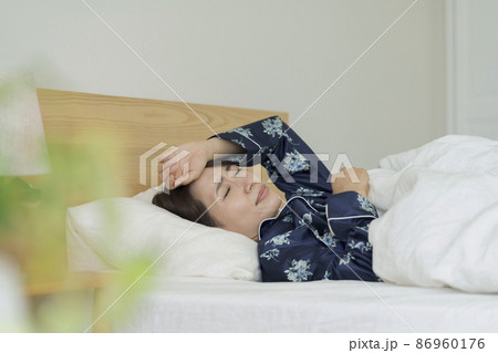 おでこに手を当てベッドに寝ているミドルの女性