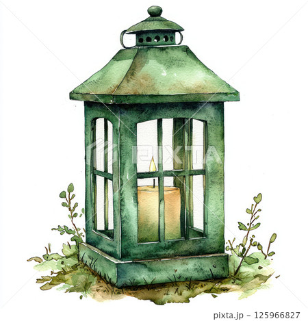 Watercolor lantern with candle, whimsical design, green color, isolated on white background, high quality for commercial use