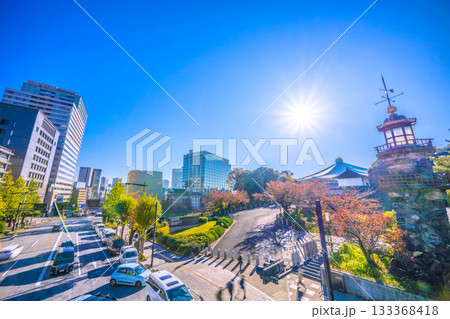 日本の東京都市景観明日へ…九段下駅や昭和館、九段会館、日本武道館などを望む…希望の光=11月21日