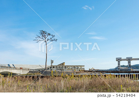 岩手県陸前高田市 気仙川の対岸から津波復興祈念公園の震災遺構を眺める