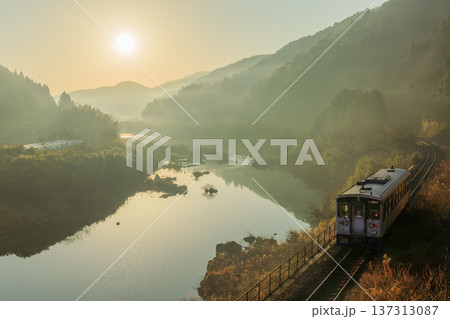 強烈な逆光の朝日を浴びて日本最後の清流・四万十川に沿って走る予土線の気動車