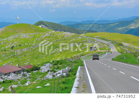 四国カルスト・天空の道・アルプスのような絶景を進む白い自動車・姫鶴平付近・愛媛県・高知県(1)