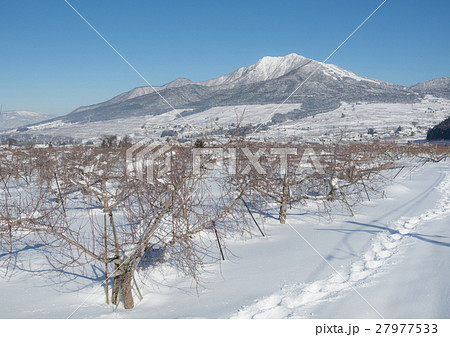 雪の高社山とりんご畑