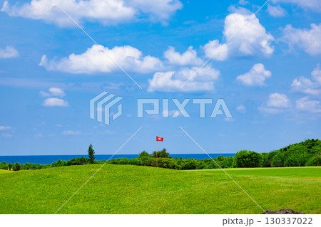 爽やかな南国の青空と青い海が映えるリゾートのゴルフ場とグリーンの旗(沖縄県宮古島市)