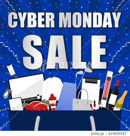サイバーマンデー 広告テンプレート/ショッピングバッグから飛び出る色々な品 青背景(横長)