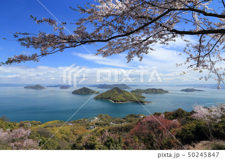 桜満開の紫雲出山から塩飽諸島の粟島、高見島などを見る