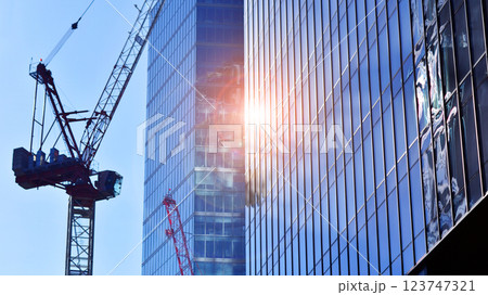 Crane on the construction site in a site surrounded by the high buildings.