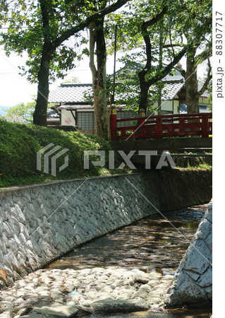 日本一低い谷中中央分水界がある水分れ公園を流れる川と赤い橋(兵庫県丹波市氷上町石生)