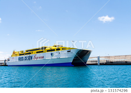 明るい日差しの下の防波堤に囲まれた港に停泊する高速フェリー カナリア諸島のフエルテベンテュラ島にて