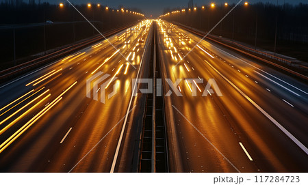 高速道路ハイウェイの夜の風景と車のライトが流れる様子を描いたAI生成画像