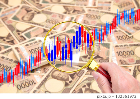 大量の日本円を背景にしたローソク足チャートを虫メガネでチェックする人の手元