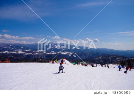 春先の鷲ヶ岳スキー場から、白山を眺める登山者(岐阜県郡上市高鷲町大鷲)※作品コメント欄に撮影位置