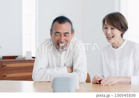 リビングでスマートスピーカに話しかけるシニア夫婦
