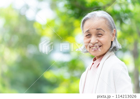 シニア女性 グレイヘアー 明るい髪色のシニア女性