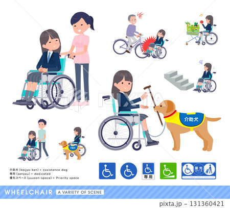 車椅子に乗る紺ブレザー女子学生のセット
