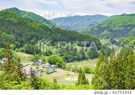 新緑と北アルプス・中央に白馬三山が見えます、長野県長野市鬼無里にて