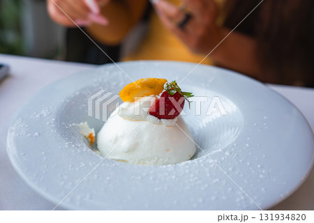 A dome of whipped cream or mousse topped with a strawberry and orange slice on a white plate, dusted with powdered sugar in a casual dining setting.