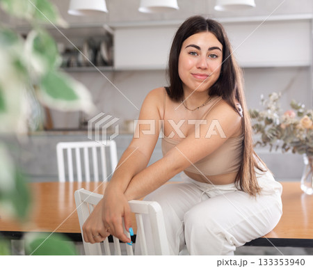 Smiling young woman posing sitting on kitchen table