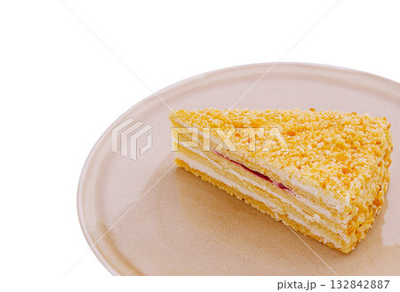 Delicious layered cake and its texture showcased on a simple white background