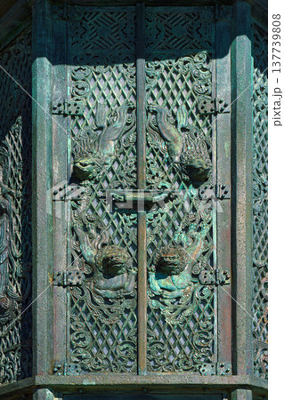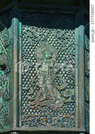 Nara, Japan - Sep 26 2024, vertical, A close-up view of one of the exterior plates of the antique bronze Toro lantern, or Condo doro with various patterns and images, without people, Nara, Japan
