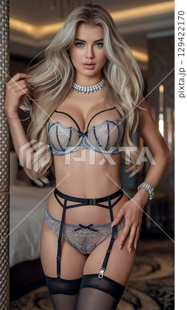 Elegant woman in silver lingerie with diamond accessories and seductive look indoors.