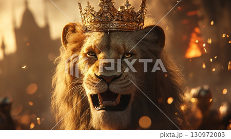 A Majestic Lion adorned with a Crown standing out beautifully against a Magical and Glittering Background