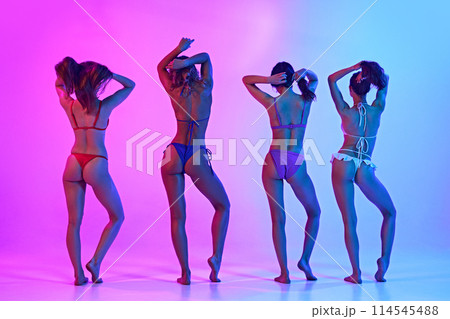 Rear view of young women, friends with slim, tanned bodies posing in swimwear in neon light against gradient background.