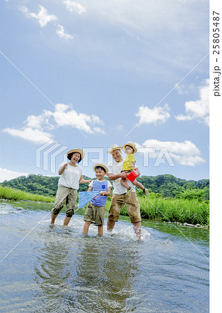 夏の河原で遊ぶ4人家族