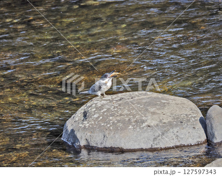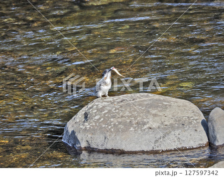川の中の石の上で魚をくわえてとまるカワセミ科最大の鳥ヤマセミ