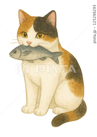 水彩で描いた魚をくわえた三毛猫のイラスト(動物・ペット)