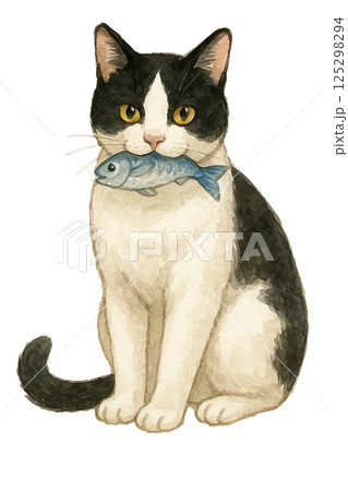 水彩で描いた魚をくわえたはちわれ猫のイラスト(動物・ペット)
