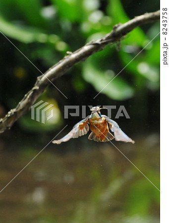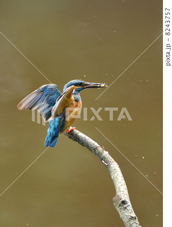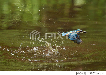 獲物をくわえたカワセミと水面の風景