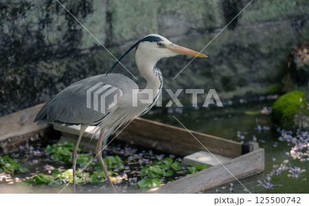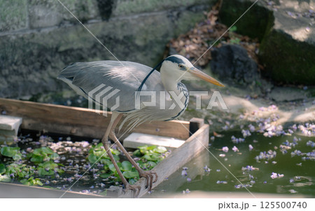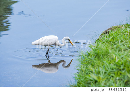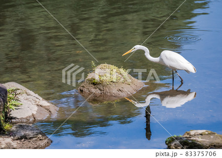 池のほとりで魚を狙うシラサギ、白い鳥、よく見かける鳥、白鷺、