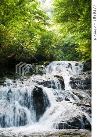 新緑の木立と滝