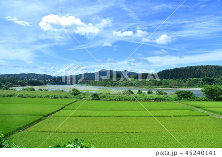 新潟県津南町 夏の魚沼産コシヒカリの田んぼと自然の風景
