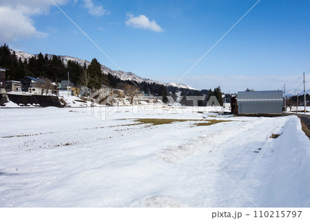 新潟県魚沼市の町並み 只見線の電車 魚沼田中近く 冬晴れの青空 田舎の散歩
