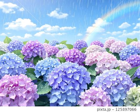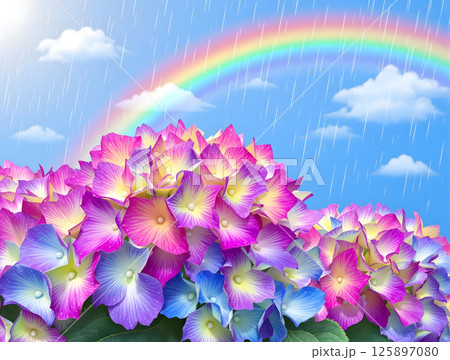 雨の残る青空と虹をバックにカラフルな紫陽花の花々